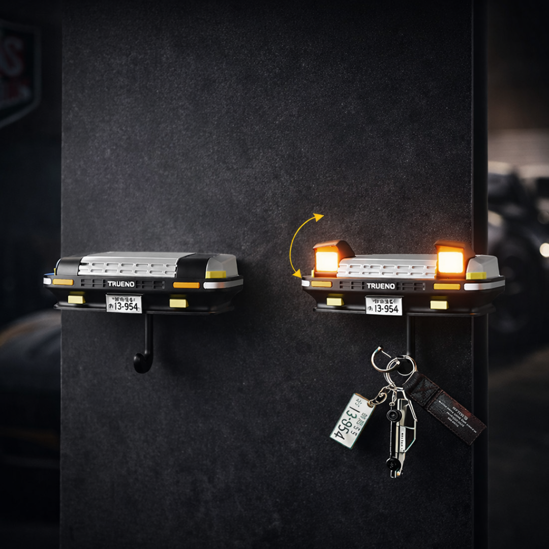 Al colgar tus llaves en el gancho, se activan automáticamente los faros retráctiles inspirados en el legendario Toyota AE86 y se iluminan al instante.